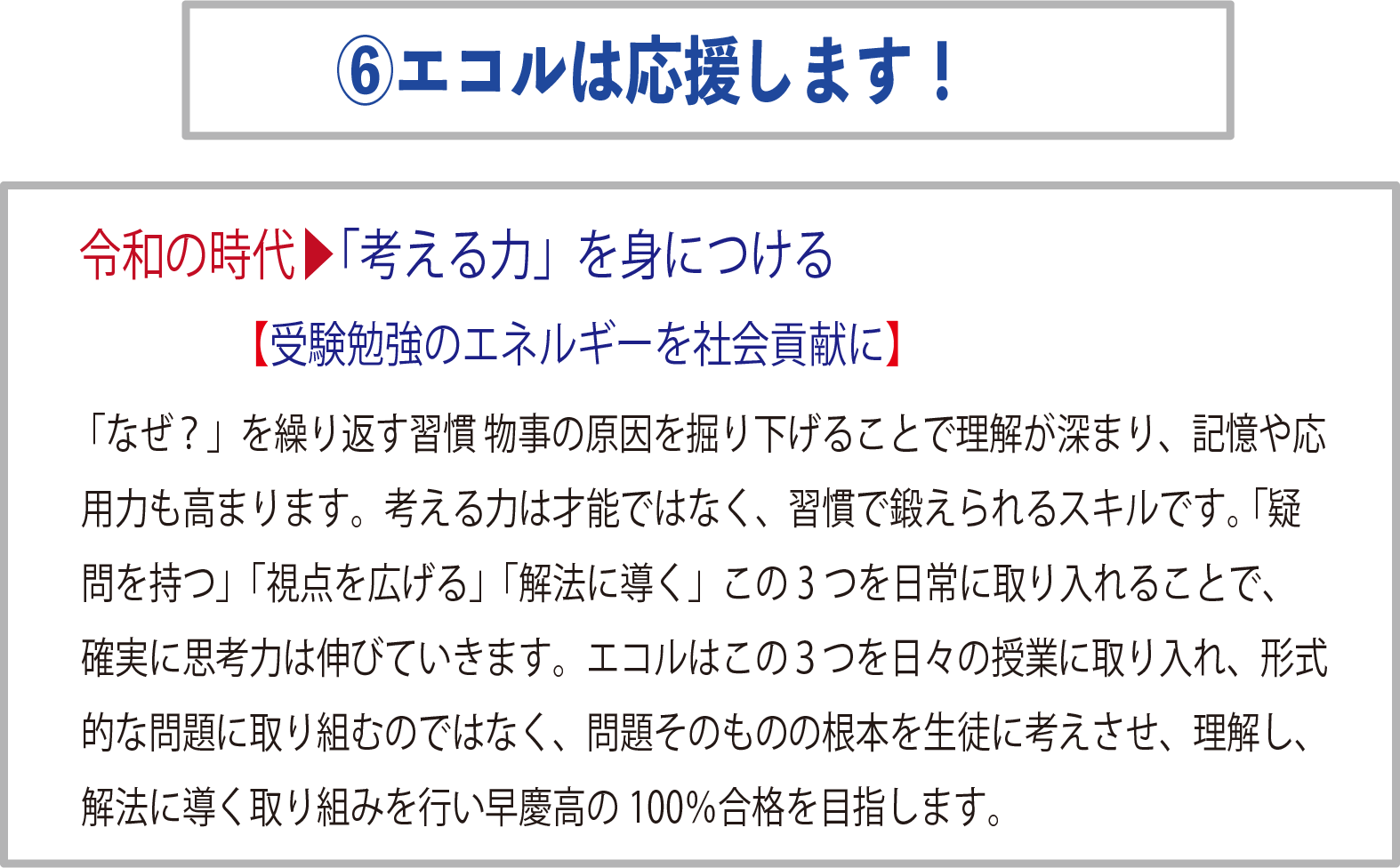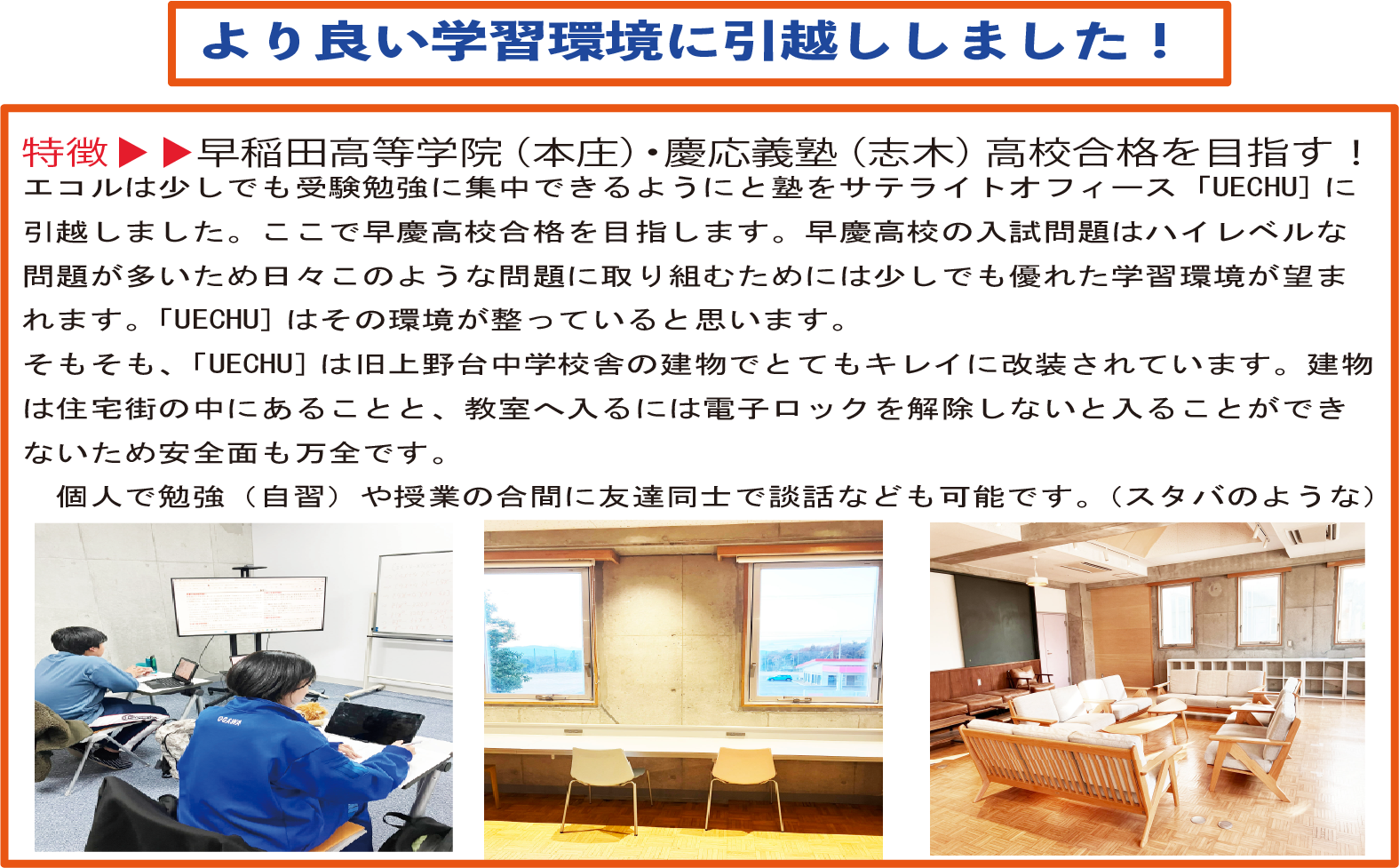 カリキュラムも早稲田高等学院(グループ)・慶應義塾受験(グループ)用に作成。募集人数は各学年10名という完全少人数で100%合格を目指します。 |